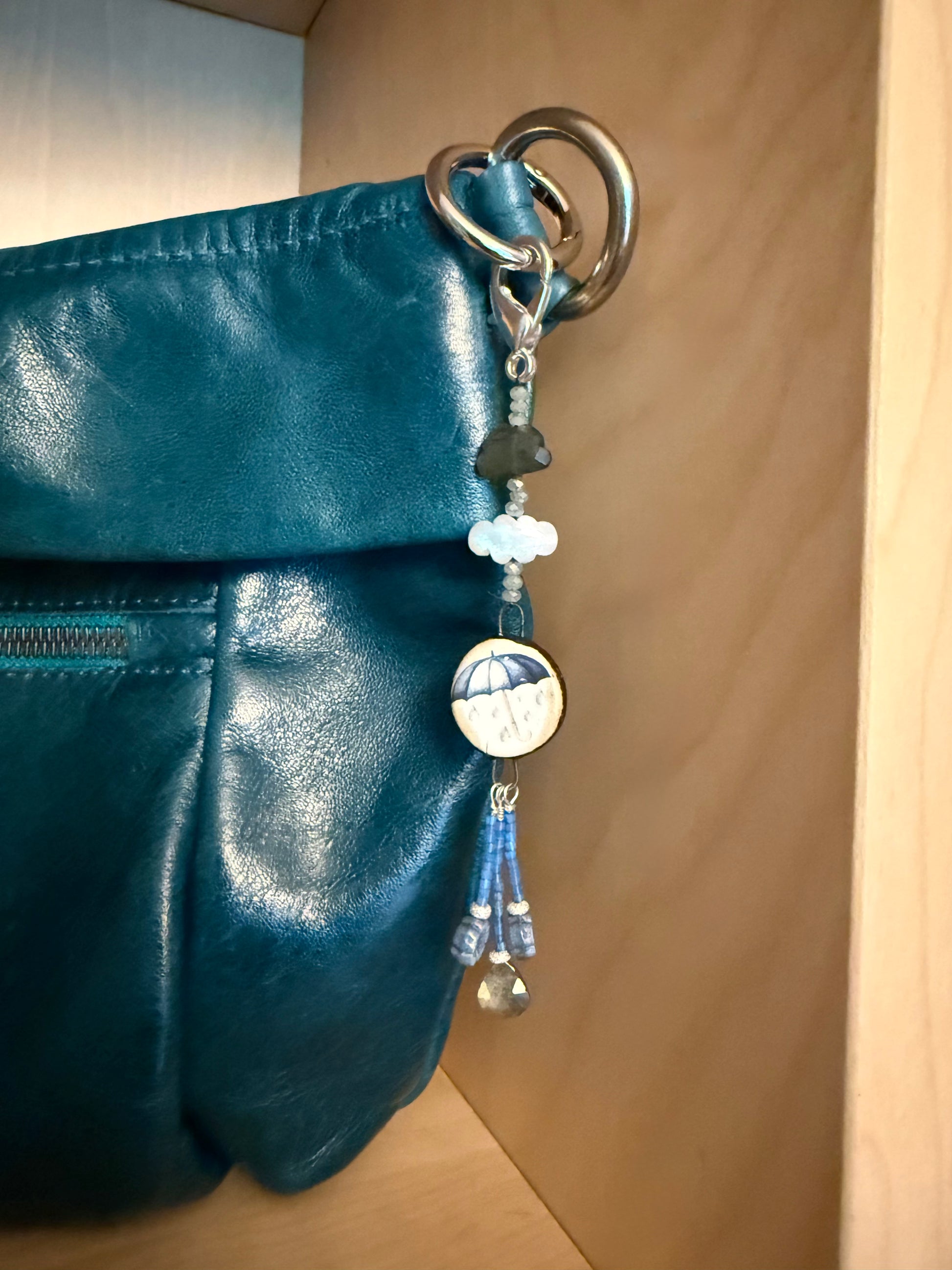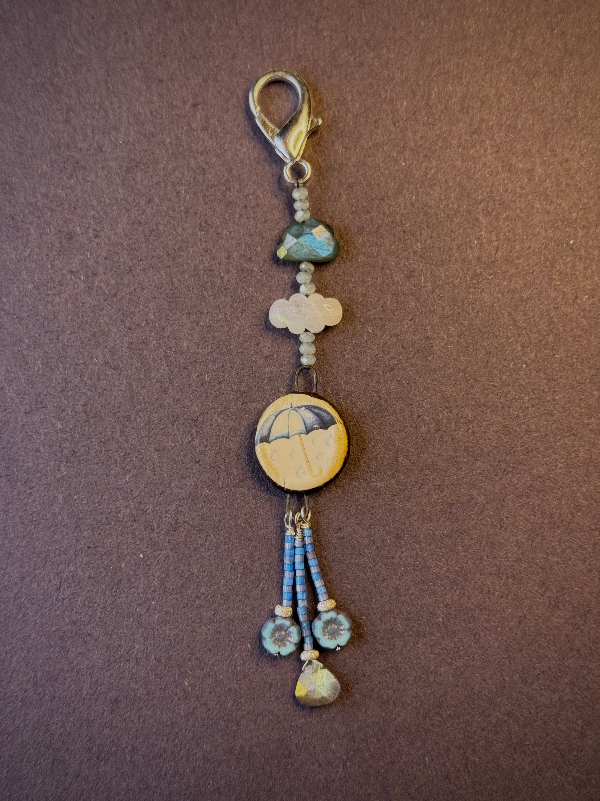 In this one-of-a-kind purse flair, sparkling crystals emanate from two clouds (one a labradorite and the other a rainbow moonstone). A handmade ceramic umbrella charm, sourced from an artist in Scotland, softens the rainfall. Below, swing three strands made up of shimmering Miyuki Delica beads and stardust rondelles in pure sterling silver. The center strand terminates with a labradorite raindrop, representing the life-giving water settling into the earth; the strands on either side feature cheerful Czech glass blossoms.