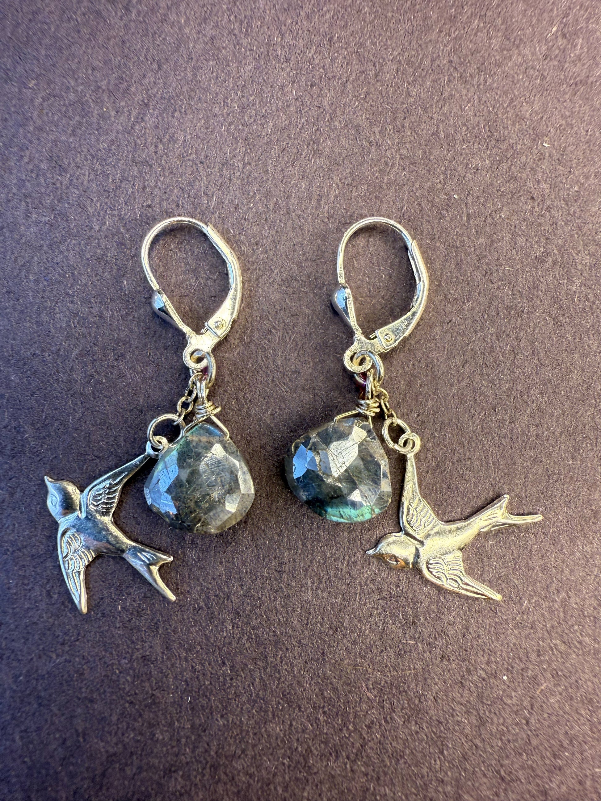 Materials: Sterling silver swallow charms, mystic labradorites, and sterling silver building materials (including jump rings, wires, and ear wires).