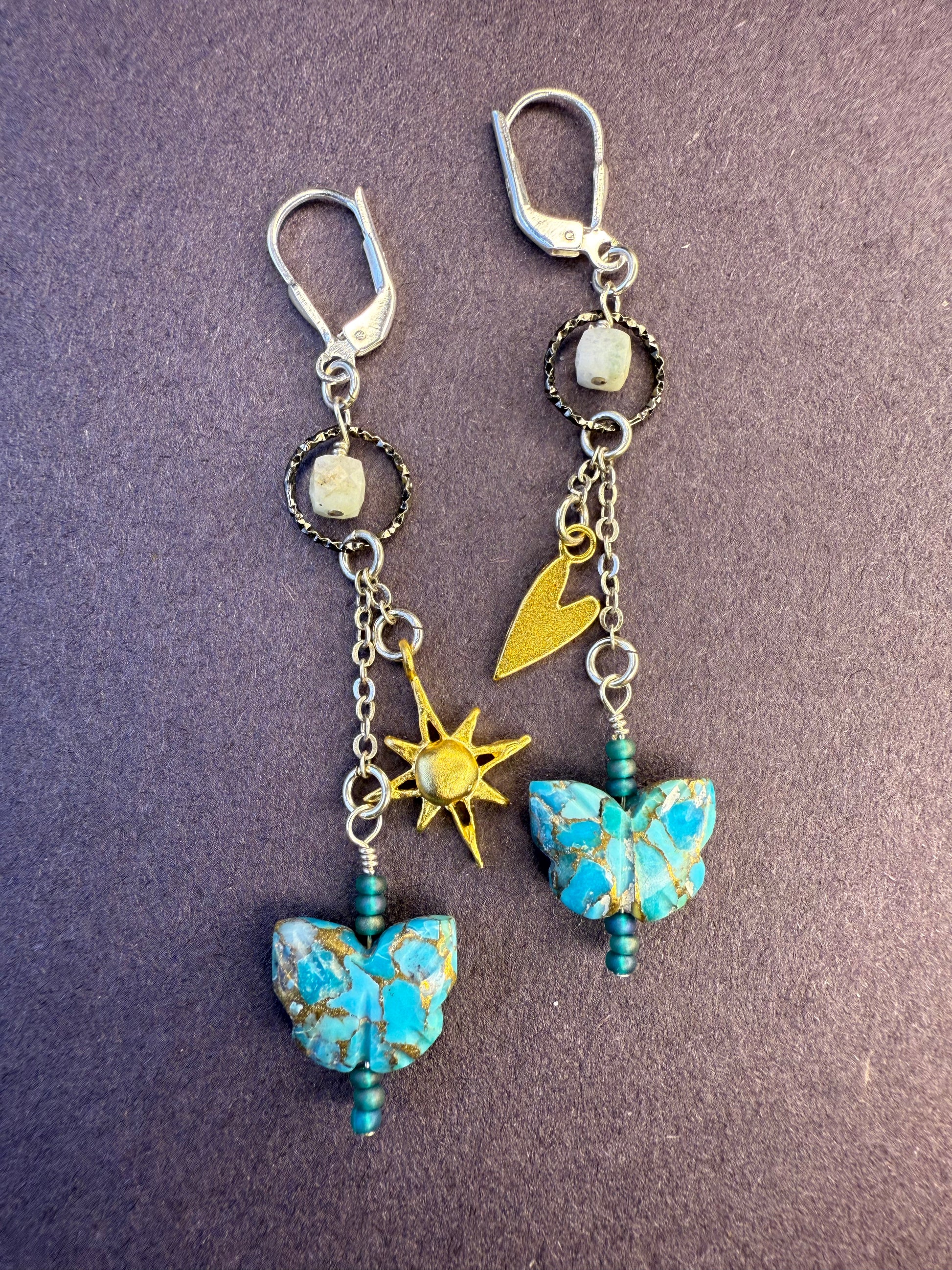 AAA African copper turquoise butterflies | white agate cubes | 18k matte gold heart and north star | oxidized sterling silver diamond cut rings | sterling silver chains | sterling silver hardware | Czech glass beads
