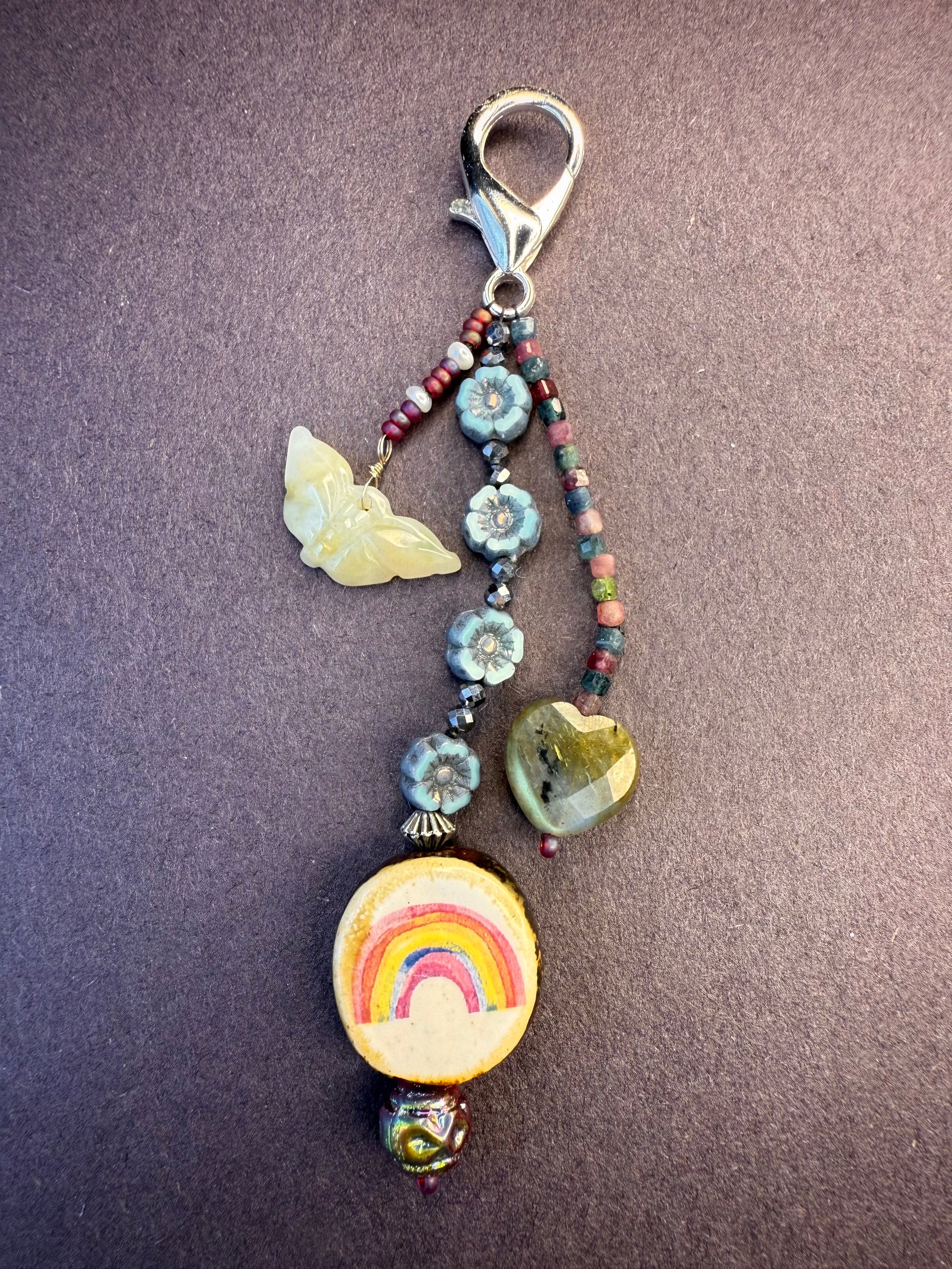 Ceramic rainbow bead | Labradorite heart | Moonstone moth | Tourmaline cubes | Pearls | Czech glass flowers and beads | Crystals | Sterling silver wire | Silver plate clasp and bead