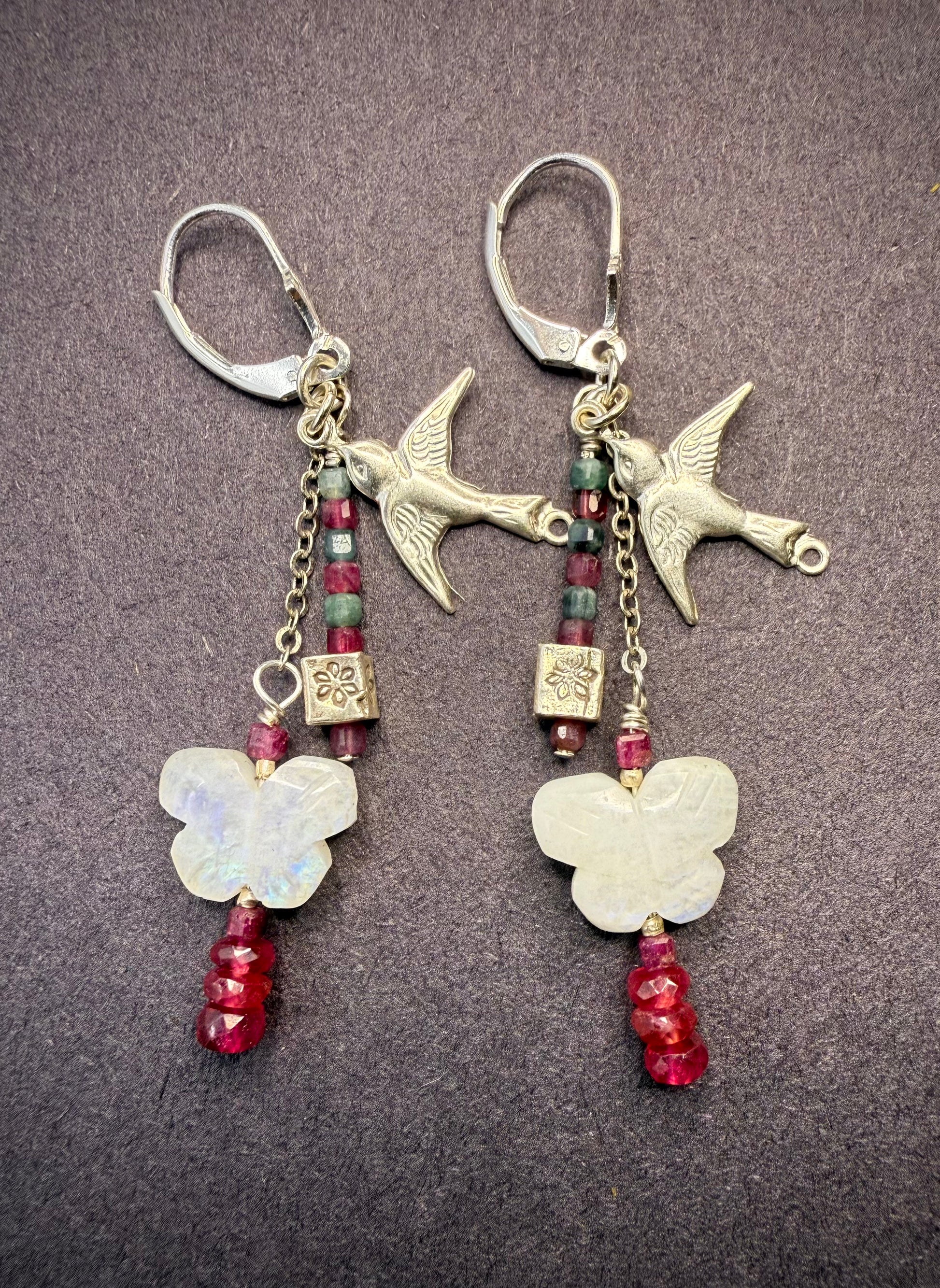 Rainbow moonstone butterflies | Sterling silver sparrows and cubes | Rubies | Red and green tourmalines | Sterling silver headpins, chain, and ear wires