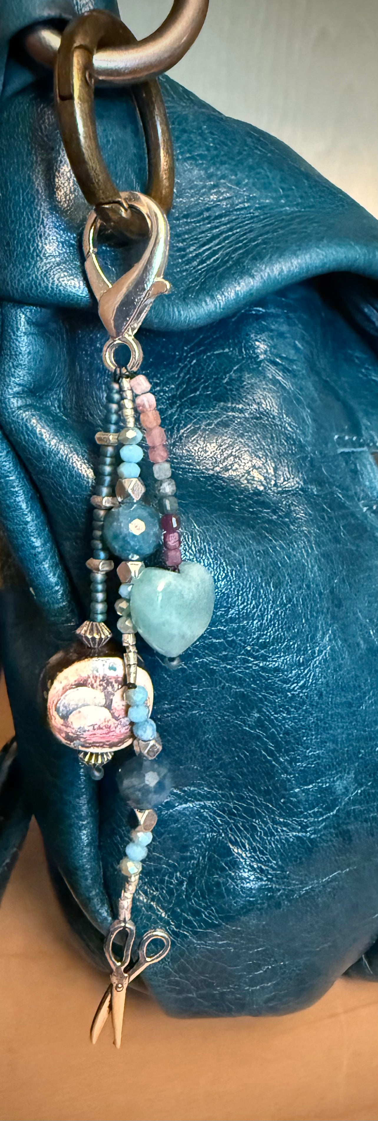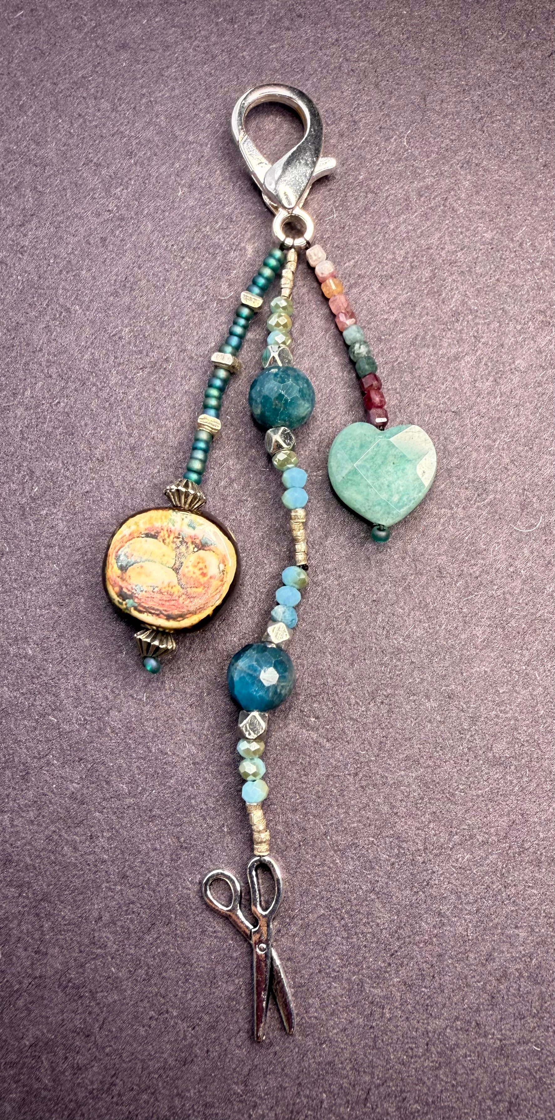 Handmade ceramic bead (sourced from Scotland) | Amazonite heart | Scissor charm | Apatite and tourmaline beads | Sterling silver and silver-toned beads and findings | Czech glass and crystal beads
