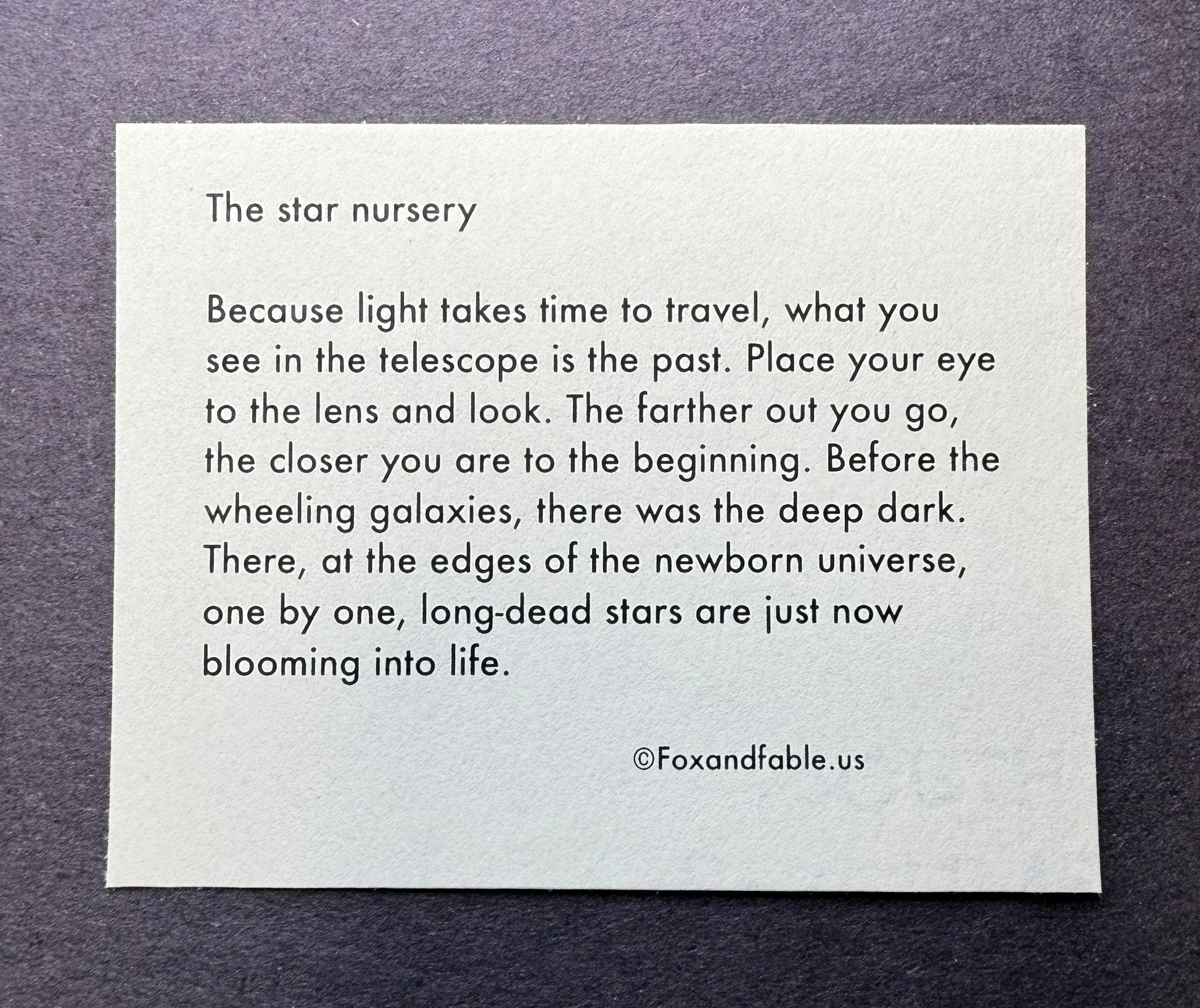 Because light takes time to travel, what you see in the telescope is the past. Place your eye to the lens and look. The farther out you go, the closer you are to the beginning. Before the wheeling galaxies, there was the deep dark. There, at the edges of the newborn universe, one by one, long-dead stars are just now blooming into life.