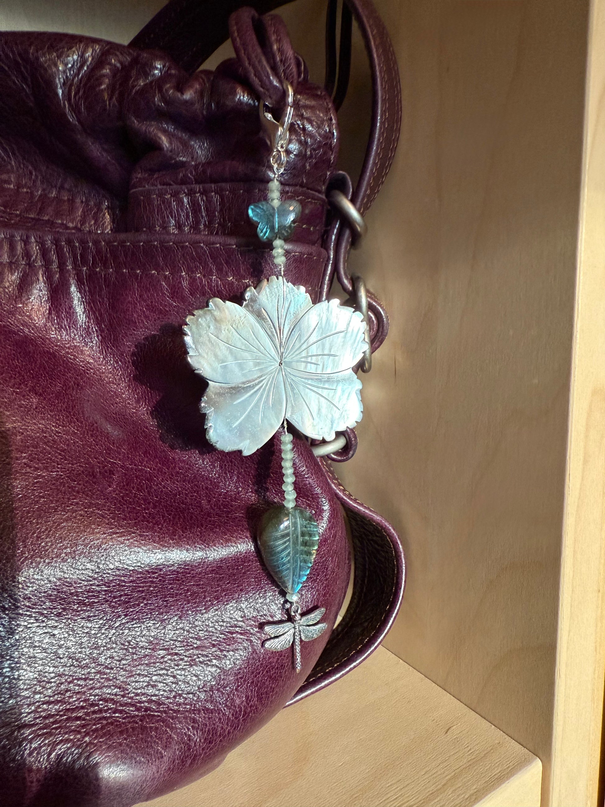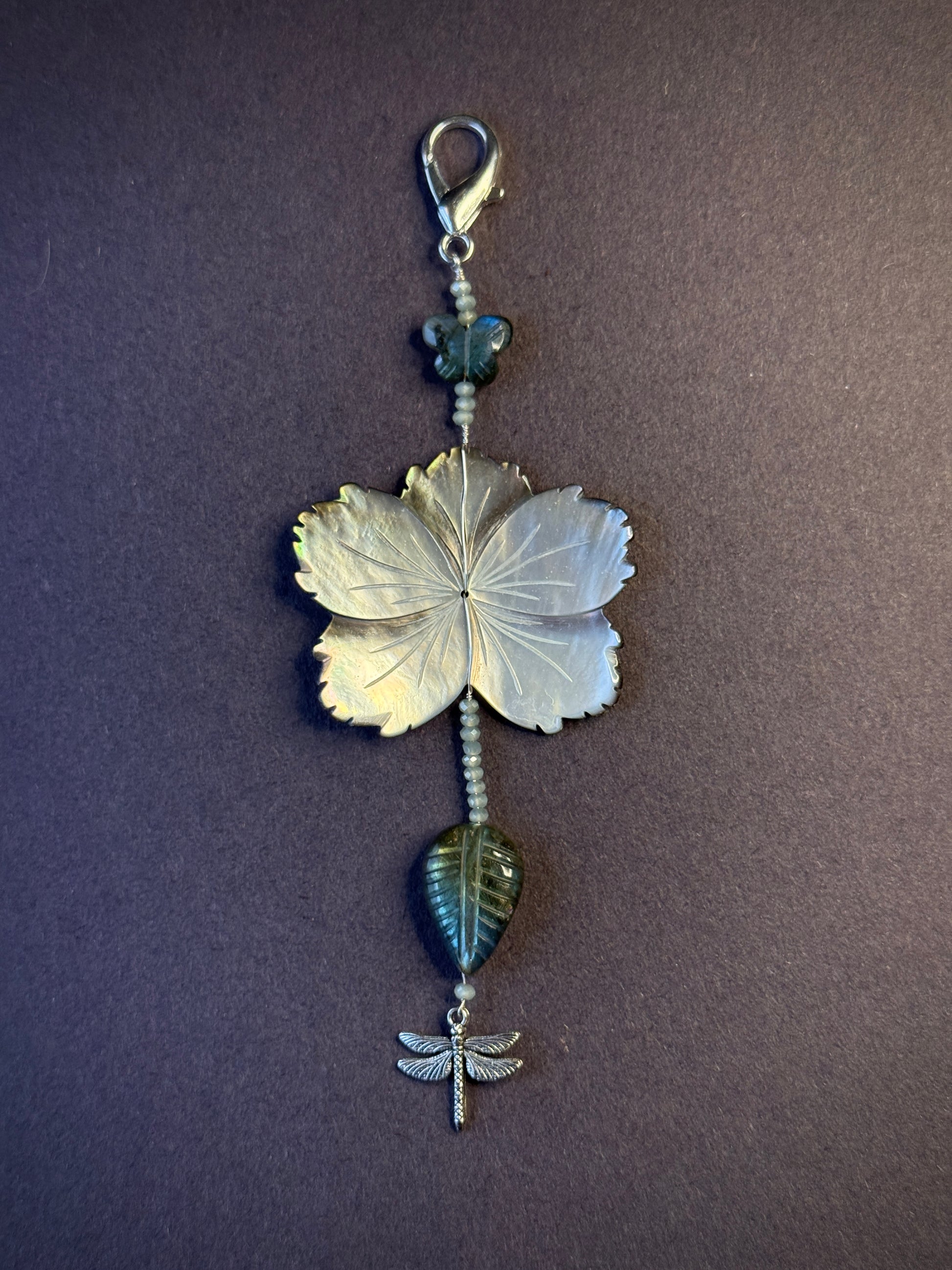 Mother of pearl hibiscus | Labradorite butterfly and leaf | Dragonfly charm | Crystal beads