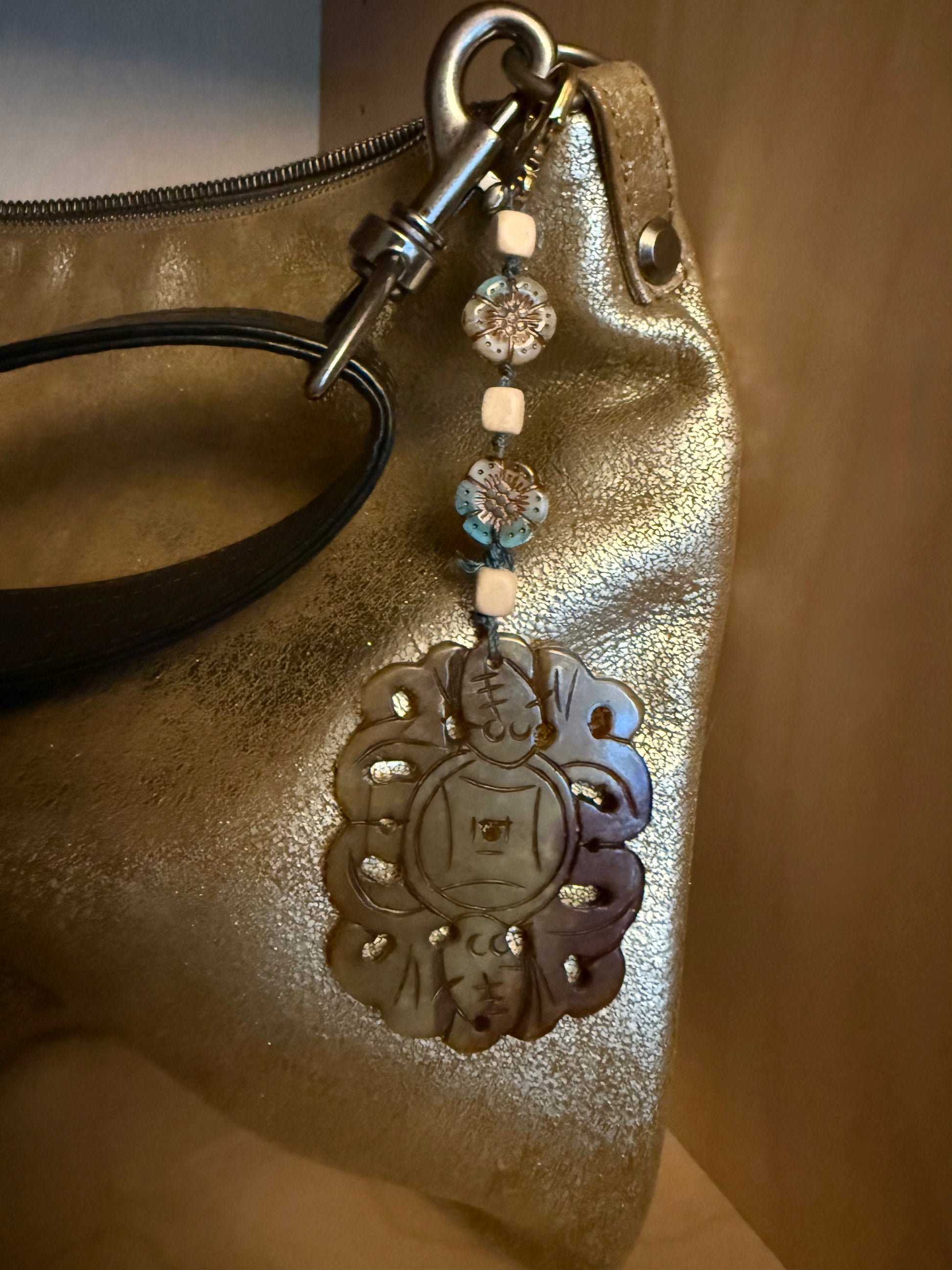 This hand-tied piece is a meditative answer to the pressure of perfectionism. A khaki-toned, vintage pendant with an Asian design hangs slightly off-center on a peacock colored strand. Above it, worn wooden beads and two-toned Czech flowers, represent the blooming of beauty in unexpected places.